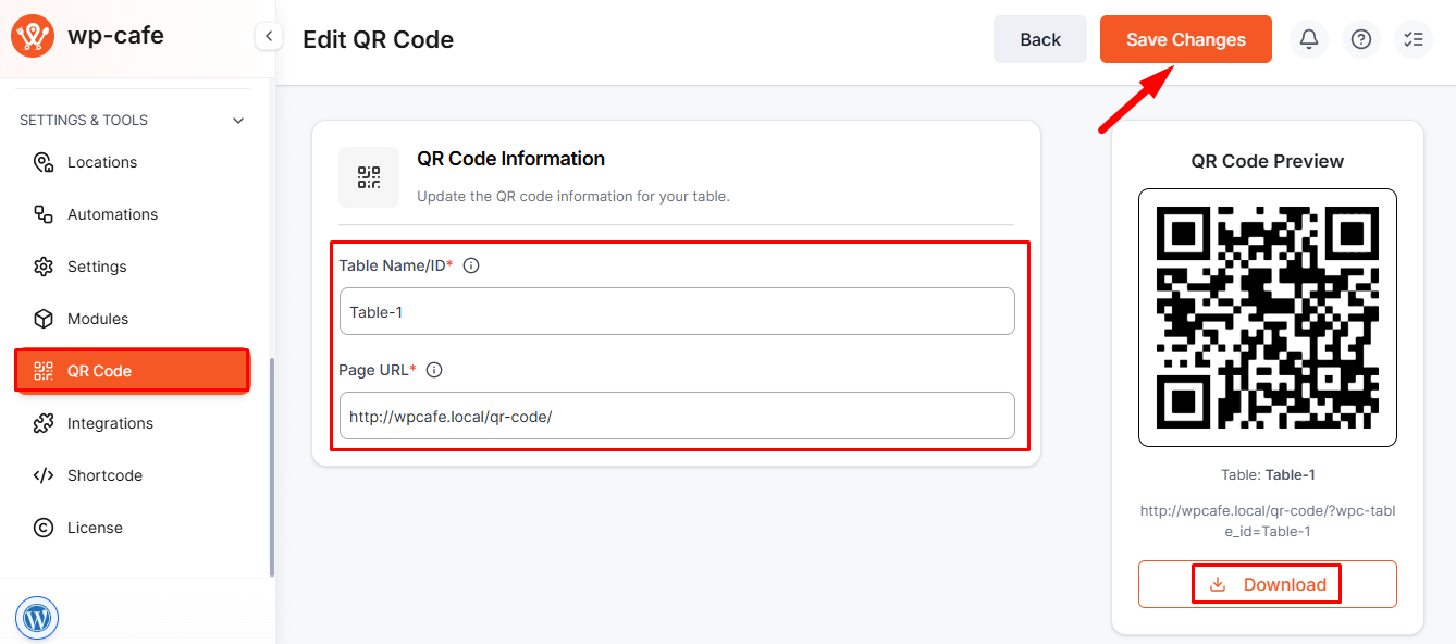 Once the module is enabled, go to WPCafe > QR Menu. Click the Create QR Code button.