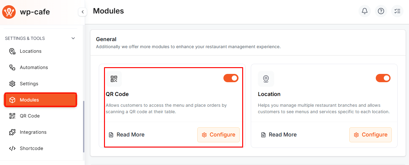 Before generating any QR code, the module must be active. Go to WPCafe > Settings & Tools > Modules. Find the QR Code module and switch it on. This enables QR menu features across your site.