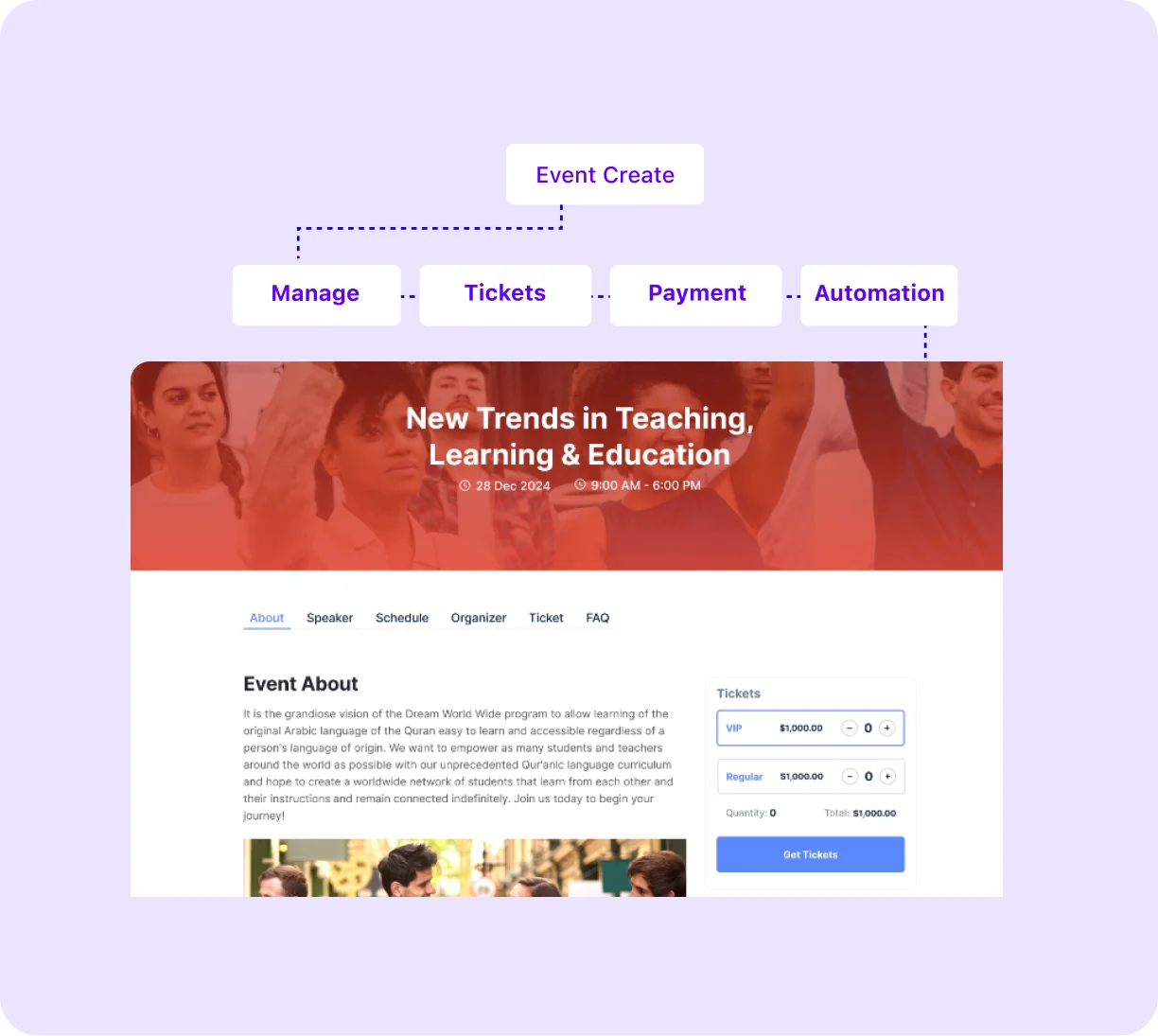 Create and manage events, sell tickets, collect registrations, handle payments, and track every attendee from your WordPress dashboard, without add-on dependency or relying on multiple plugins.