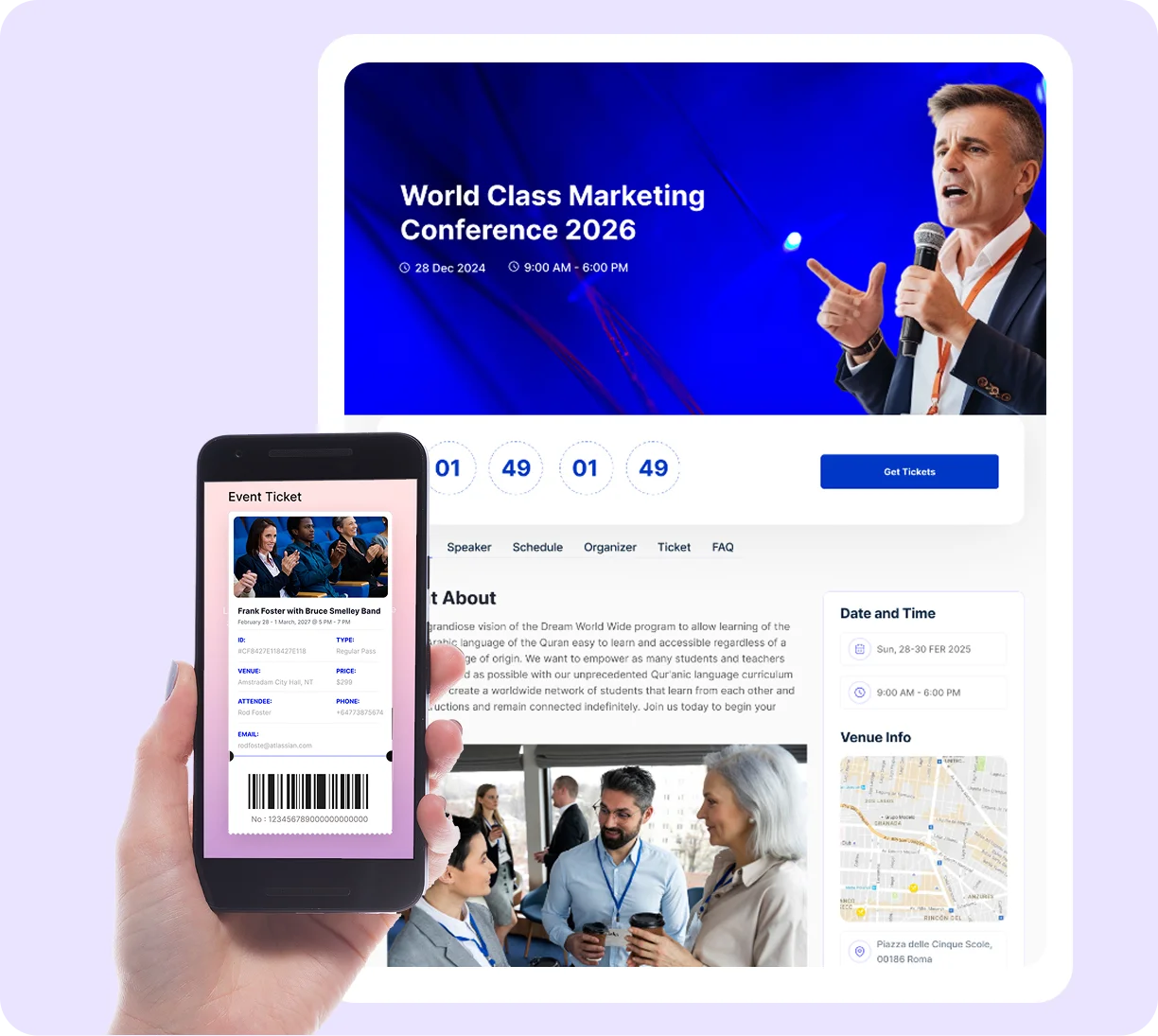 Create multiple ticket types, set pricing, manage inventory, and accept payments directly on your site with no platform commission. Every ticket includes a unique QR code sent automatically to attendees. On event day, scan tickets from any device and track check-ins in real time with duplicate protection built in.