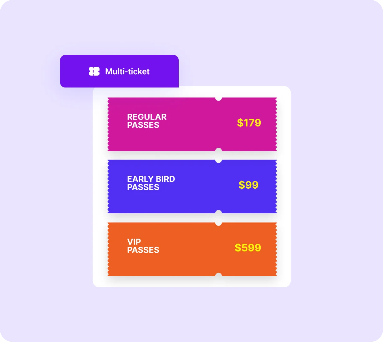 Create as many ticket tiers as your event needs: General Admission, VIP, and Early Bird. Each ticket can have its own price, quantity, and sale period. Manage everything from one dashboard and adjust your ticket strategy anytime without affecting your event structure.